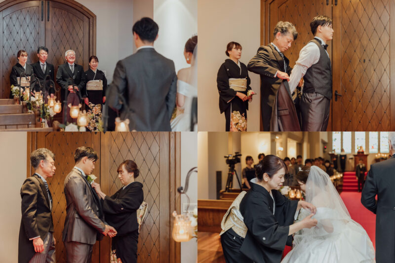 聖堂に立つ新郎様の一歩を支える、ご両親。